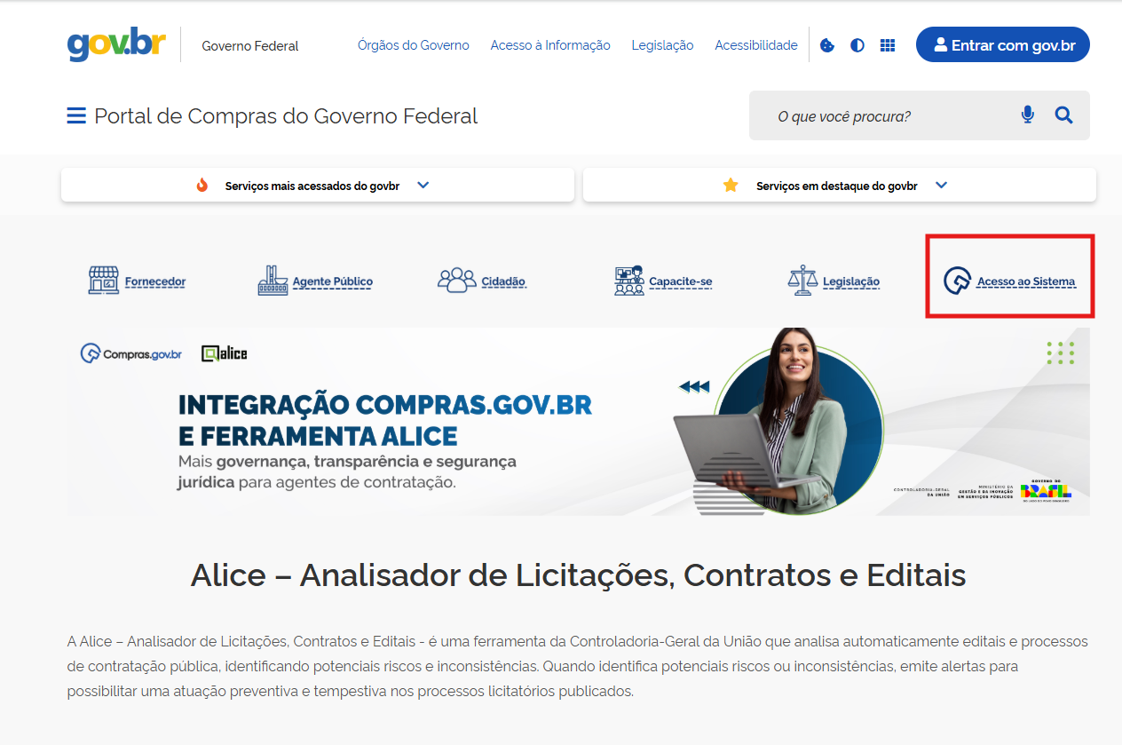 Primeiramente, deve-se acessar o sistema de Planejamento e Gerenciamento de Contratações (PGC) no endereço https://www.gov.br/compras/pt-br e, na sequência, clicar na opção “Acesso ao Sistema”, no canto direito da tela.