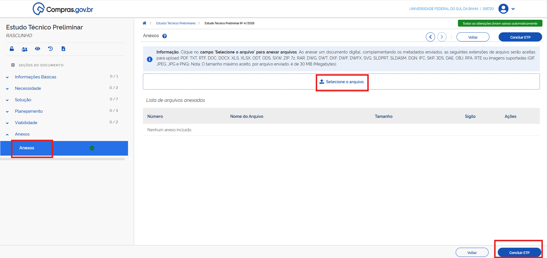 Neste campo, o usuário pode anexar outros documentos necessários ou complementares para a composição final do ETP. Ao final da elaboração do documento, o usuário deverá concluir o ETP clicando no botão “Concluir ETP”.