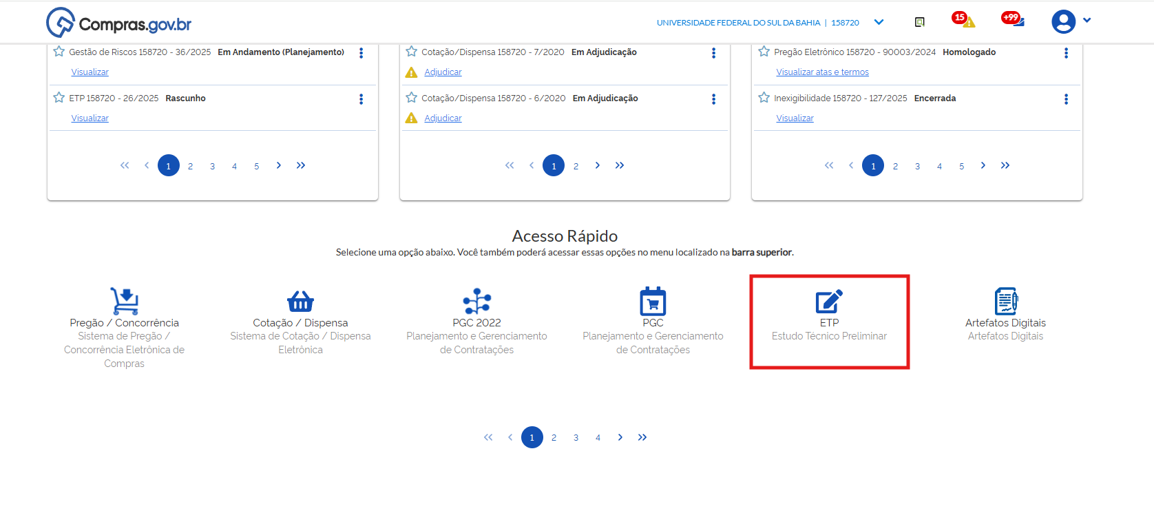 Há também a opção de acessar pela área de "Acesso Rápido" ao final da página, clicando também em "ETP":