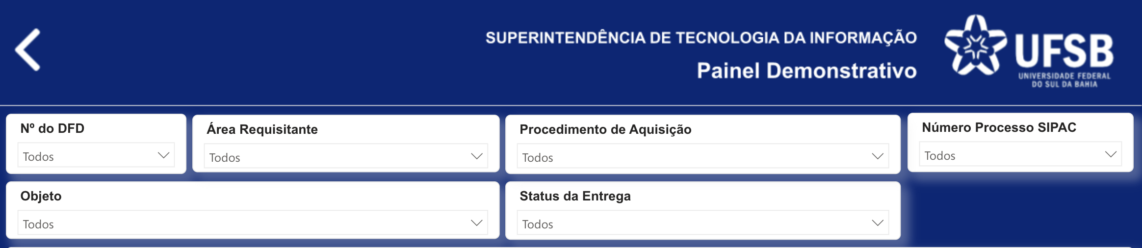 Todas as abas do Painel de Compras de TI contam com filtros interativos, localizados no topo da visualização. Esses filtros permitem ao usuário refinar os dados exibidos nas tabelas, possibilitando análises segmentadas por tipo de processo, objeto, setor requisitante, status de entrega, entre outros.