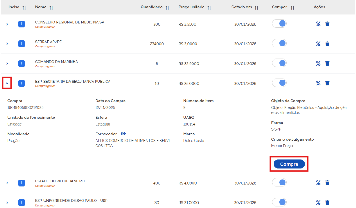 Para que as cotação divergentes deixem de integrar o cálculo do valor estimado, clique no botão abaixo do campo “Compor”, tornando-o inativo. O valor da mediana será automaticamente recalculado, passando a refletir de forma mais adequada o valor unitário da cápsula.