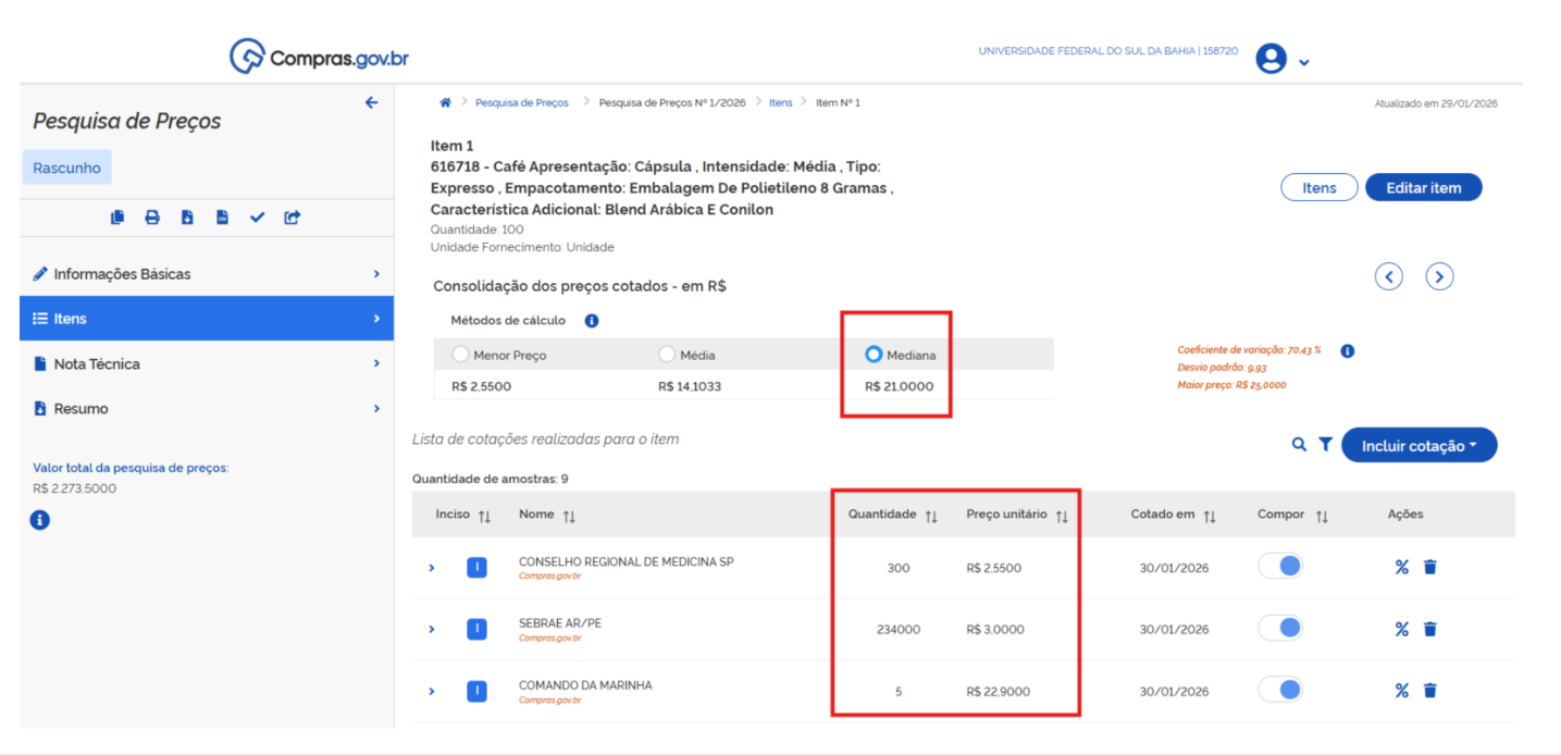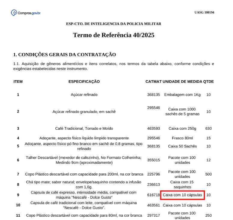 O demandante deve, portanto, considerar apenas as cotações cujos valores unitários estejam alinhados ao mesmo critério especificado no Termo de Referência, seja por cápsula unitária ou por caixa contendo cápsulas. No exemplo apresentado (café), a quantidade total refere-se a 100 cápsulas unitárias, e não a 100 caixas com 10 cápsulas cada.
