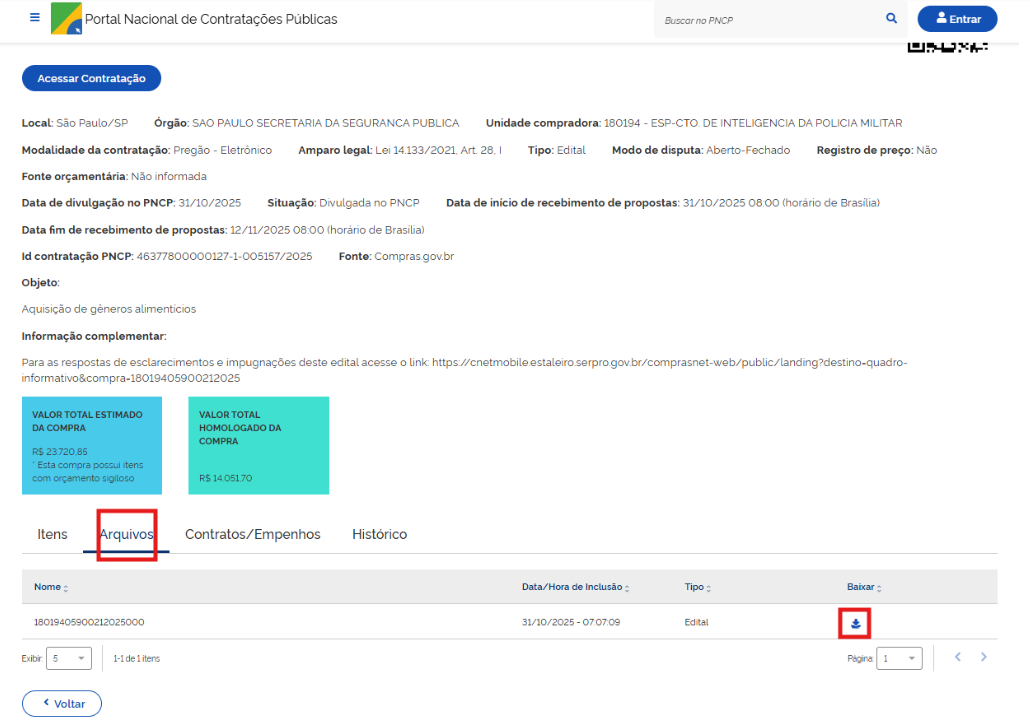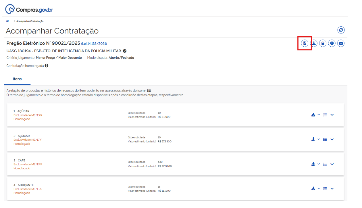 Na página seguinte, clique no ícone “Documentos e demais informações da contratação no PNCP”: