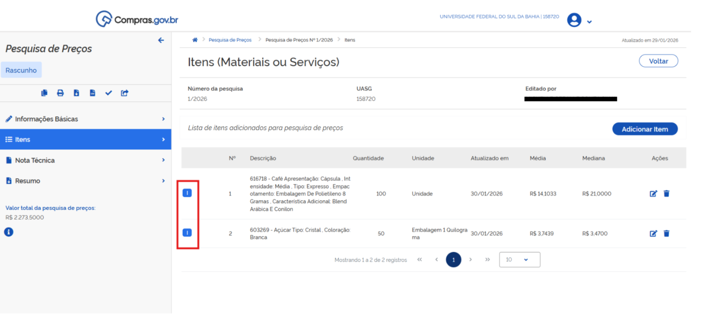 Conforme se observa na imagem acima, os valores de pesquisa de preço de ambos os itens usados no exemplo (café e açúcar) são oriundos da composição de custos unitários menores ou iguais à mediana do item disponibilizada no Portal Nacional de Contratações Públicas (PNCP) em atendimento ao art. 23, § 1º, inciso I, da Lei Federal nº 14.133 de 2021.