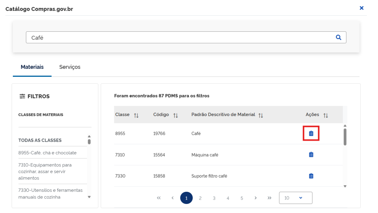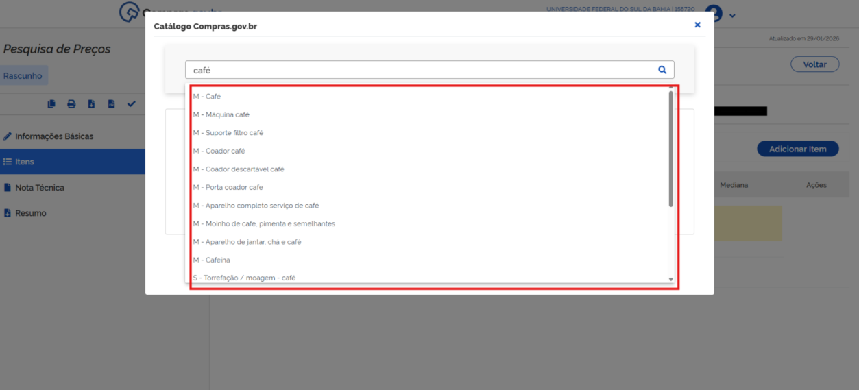 Em seguida, informe o nome do item (material ou serviço) para o qual se pretende obter o orçamento e selecione-o entre as opções apresentadas: