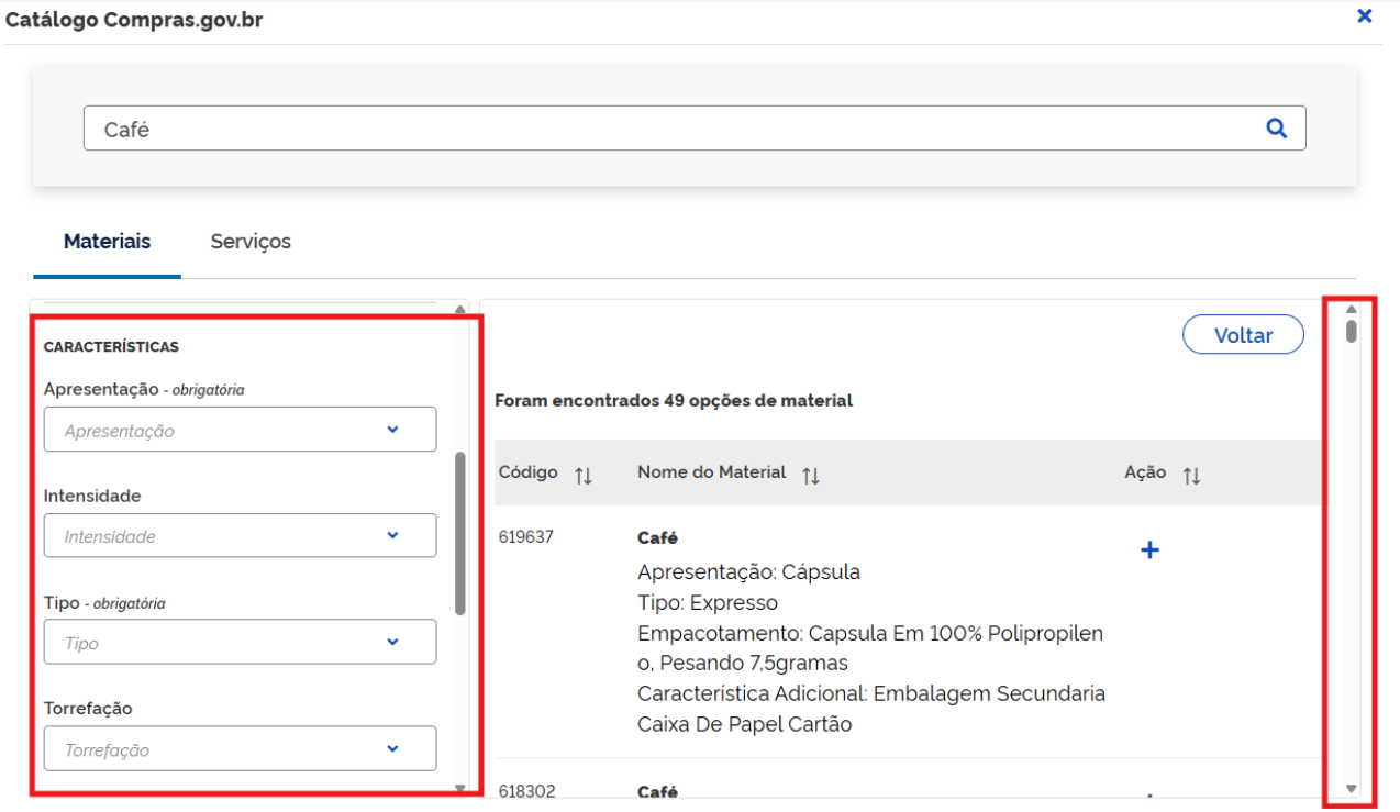Especifique o item para o qual deseja obter o orçamento. Para essa etapa, o demandante poderá usar a barra de rolagem a fim de procurar entre as opções apresentadas o item para o qual deseja obter o orçamento ou preencher os filtros no campo "Características":