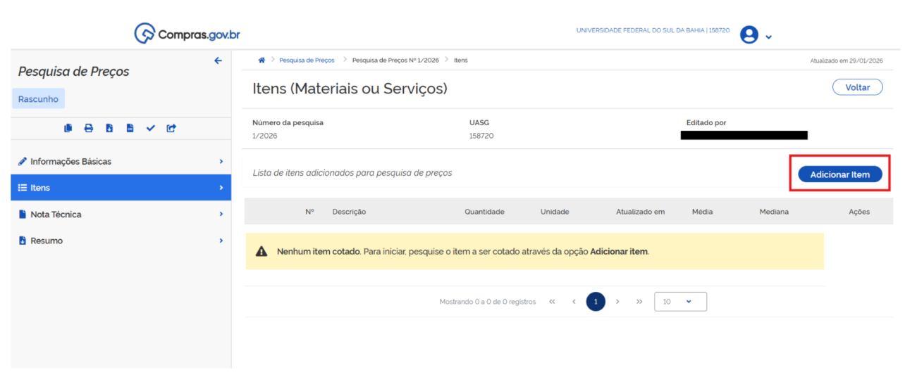 Certifique-se de que a descrição do item (material / serviço) a ser selecionado para obtenção de orçamento esteja compatível com a necessidade da unidade requisitante.