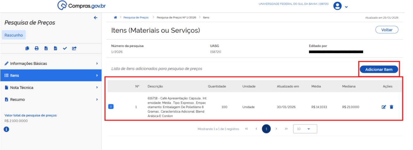 O item será adicionado a "Lista de itens adicionados para pesquisa de preço". Repita os passos anteriores, clicando em "Adicionar Item", caso seja necessário incluir outros itens: