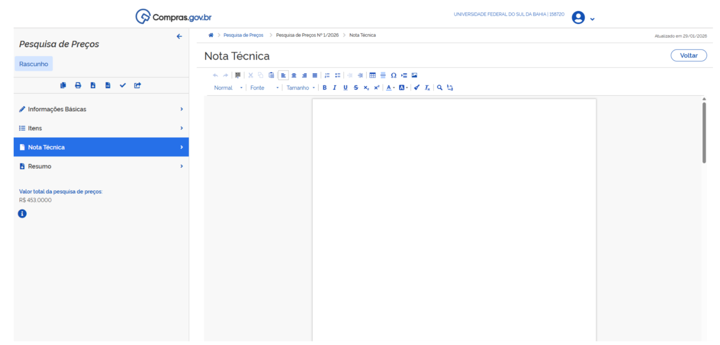 Para preenchimento da Nota Técnica, adotar o "Modelo de documento de formalização da pesquisa de preços" disponibilizado pela MGI no Caderno de Logística – Pesquisa de Preço e transcrito abaixo: