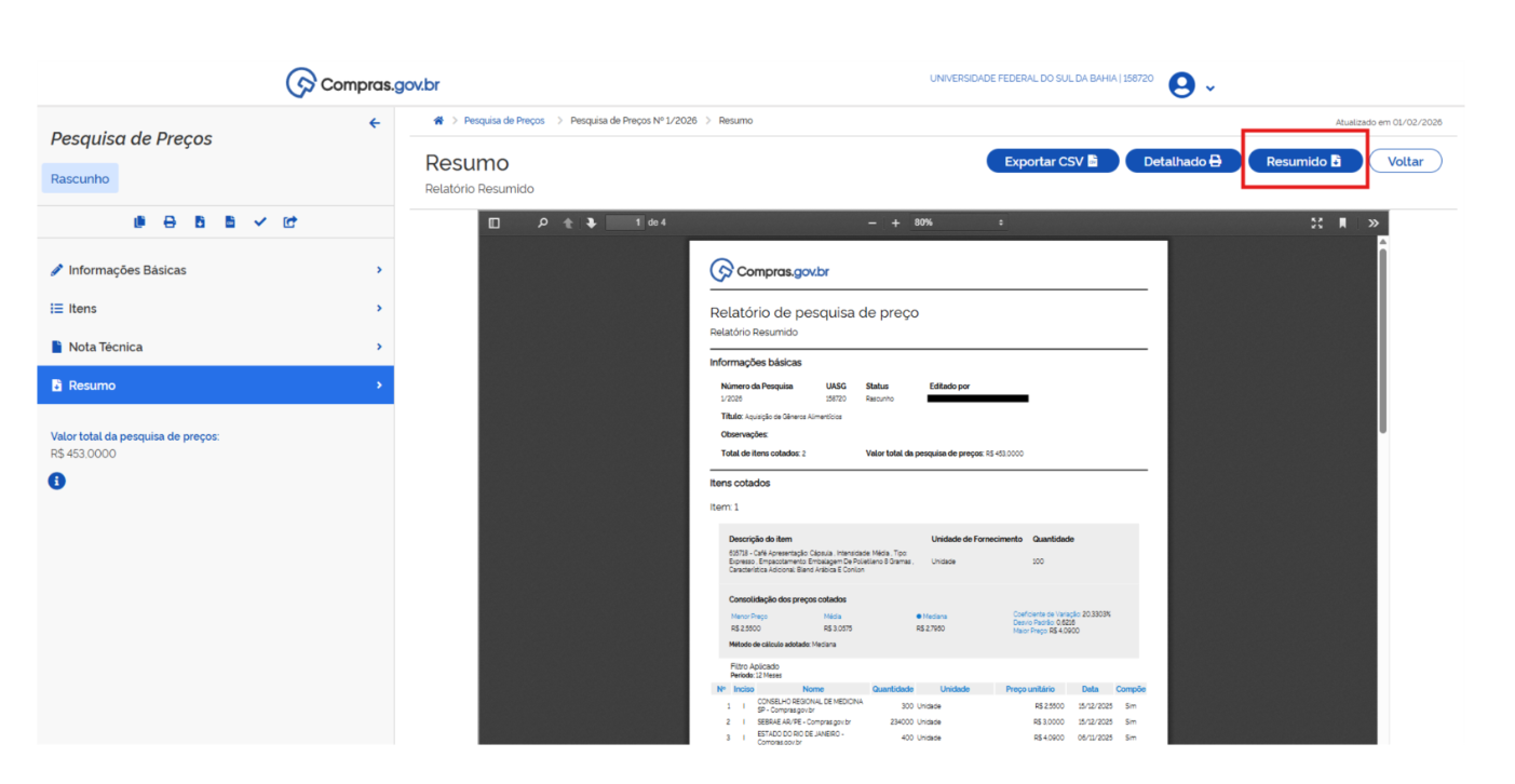 Cotação devidamente preenchida, gere o relatório com informações do objeto, memória de cálculo, agente responsável pela pesquisa, fontes e parâmetros consultados, entre outros. Para isso, entre no menu "Resumo" e clique em "Detalhado" ou "Resumido".