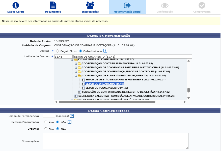 Insira as informações da Movimentação Inicial do Processo a ser cadastrado. Para isso, informe a Unidade de Destino do processo, "Setor de Orçamento".