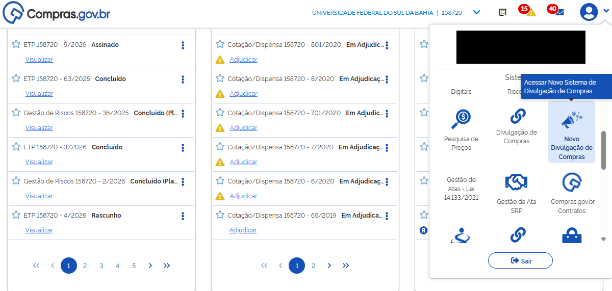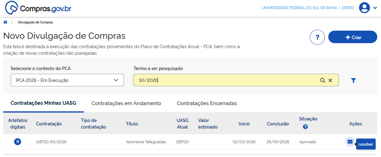 Quando o período de abertura de um processo designado ao agente de contratação estiver em vigor, o agente deve receber a contratação no sistema "Novo Divulgação de Compras" no site do Compras Governamentais.