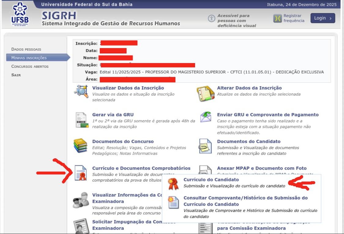 Acesse Minhas Inscrições > Curriculo e Documentos Comprobatórios > Currículo do Candidato