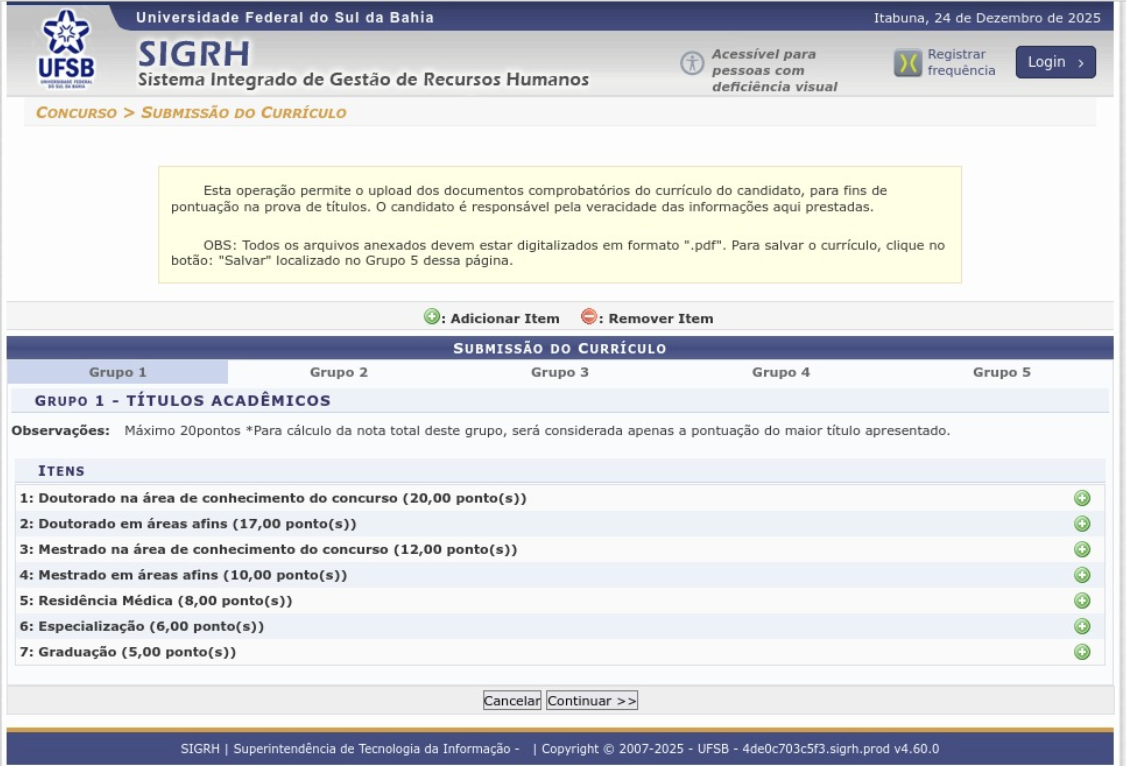 Esta operação permite o upload dos documentos comprobatórios do currículo do candidato, para fins de pontuação na prova de títulos. O candidato é responsável pela veracidade das informações aqui prestadas.