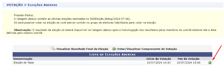 Ao clicar em Votar, o eleitor é redirecionado para a página de Eleições Abertas, na qual é possível visualizar, se houver alguma, as eleições abertas no momento, conforme exibido a seguir. Para iniciar a votação, deve-se clicar no ícone correspondente à eleição desejada.