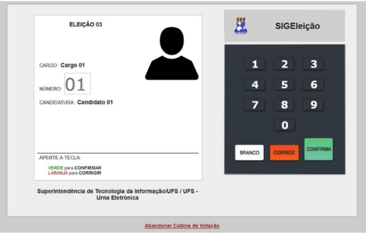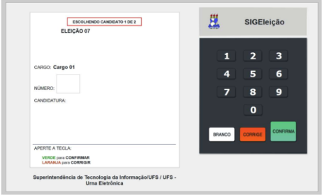 Para votar, o eleitor deve usar o teclado numérico para digitar o número correspondente ao candidato do cargo ou chapa. Após inserir o número, são exibidas do lado esquerdo as informações do cargo que está sendo votado, o número, a candidatura (candidato ou chapa) e a foto. Caso tenha errado o número e queira corrigir, clique em "Corrige" e insira o número correto.
