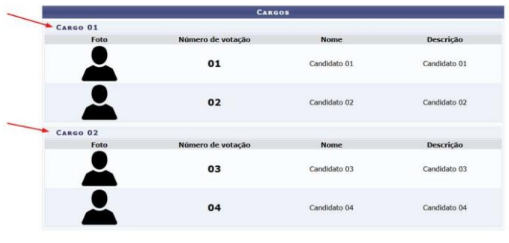 Obs.: Uma eleição pode eleger candidatos para mais de um cargo. No exemplo da imagem a seguir, a eleição envolve dois cargos distintos, cada um com dois candidatos. Nesse caso, é obrigatório registrar o voto para todos os cargos disponíveis, ainda que o voto seja registrado como nulo ou branco.