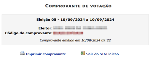 Para salvá-lo, clique em "Imprimir comprovante" e salve o arquivo. Para sair do SIGEleição, clique em "Sair do SIGEleição".