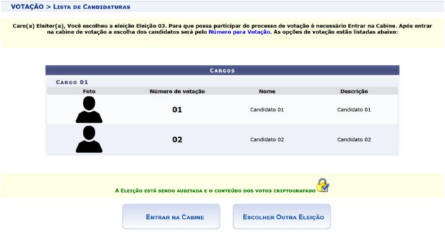 Ao clicar no ícone de uma eleição válida, isto é, uma eleição iniciada e cujo grupo de eleitores inclua o usuário, o eleitor é redirecionado e pode visualizar a lista de candidaturas da eleição. No exemplo a seguir, é exibida uma eleição de chapa única. Caso deseje prosseguir, o usuário deve clicar em "Entrar na Cabine" . Caso deseje voltar, clicar em "Escolher Outra Eleição".