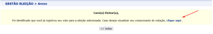 Obs.: Caso tenha finalizado a votação sem salvar o comprovante e queira obtê-lo, acesse novamente o sistema de votação. Ao tentar reiniciar o processo de votação, o sistema identificará que seu voto já foi registrado e disponibilizará a opção de download do comprovante na mensagem destacada, conforme indicado a seguir.