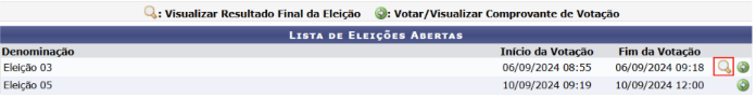 Na página de eleições abertas, clique no ícone da lupa para acessar o relatório. Caso o ícone não esteja disponível, a eleição ainda não teve o resultado homologado pela comissão eleitoral.